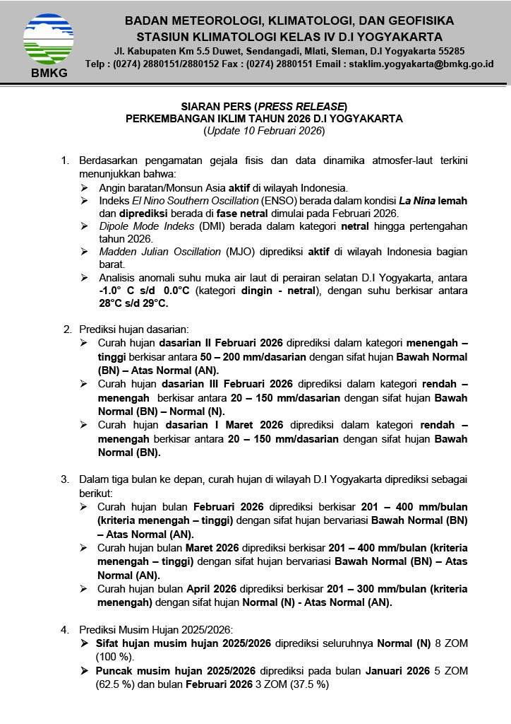 PRESS RELEASE PERKEMBANGAN IKLIM TAHUN 2026 D.I YOGYAKARTA UPDATE 10 FEBRUARI 2026