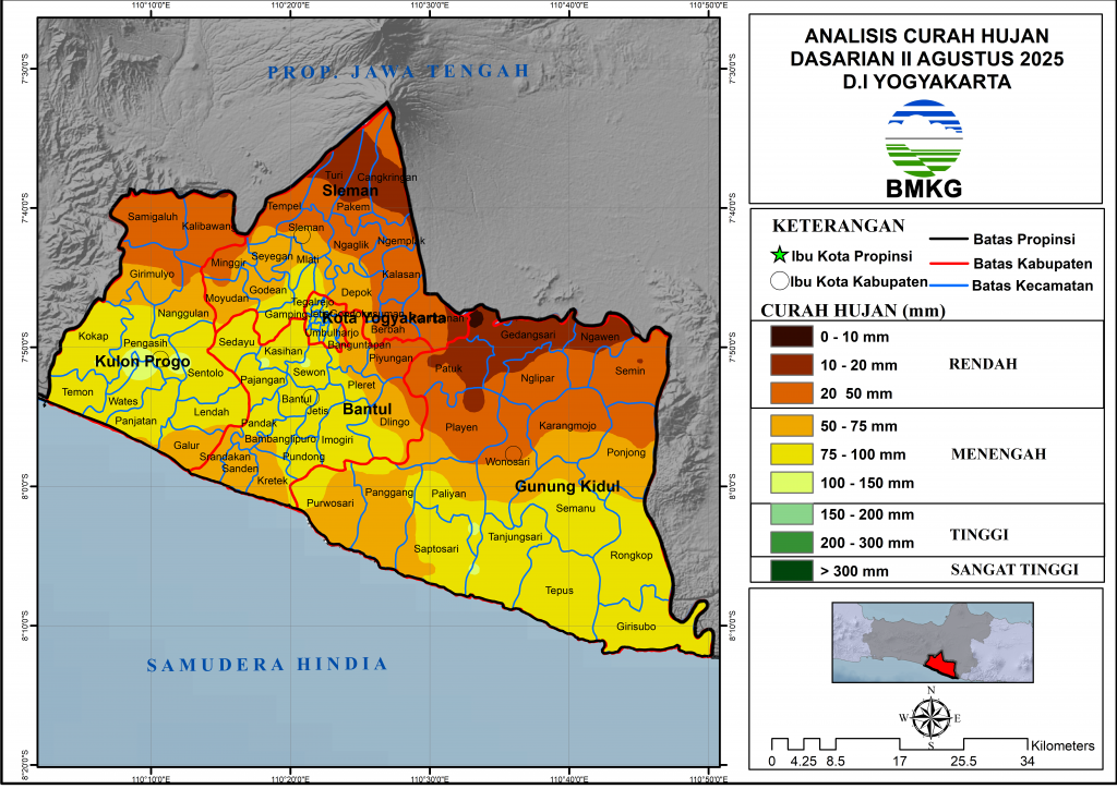 Sebaran curah hujan selama periode dasarian II Agustus 2025 (tanggal 11 s/d 20) wilayah D. I Yogyakarta dalam kategori rendah – menengah dengan curah hujan berkisar 10 – 100 mm.
