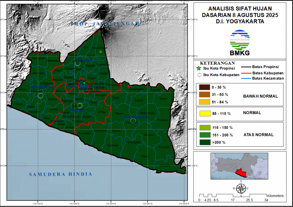 Apabila dibandingkan dengan kondisi normalnya sifat hujan dasarian II Agustus 2025 (tanggal 11 s/d 20) wilayah D. I Yogyakarta dalam kategori Bawah Atas Normal.