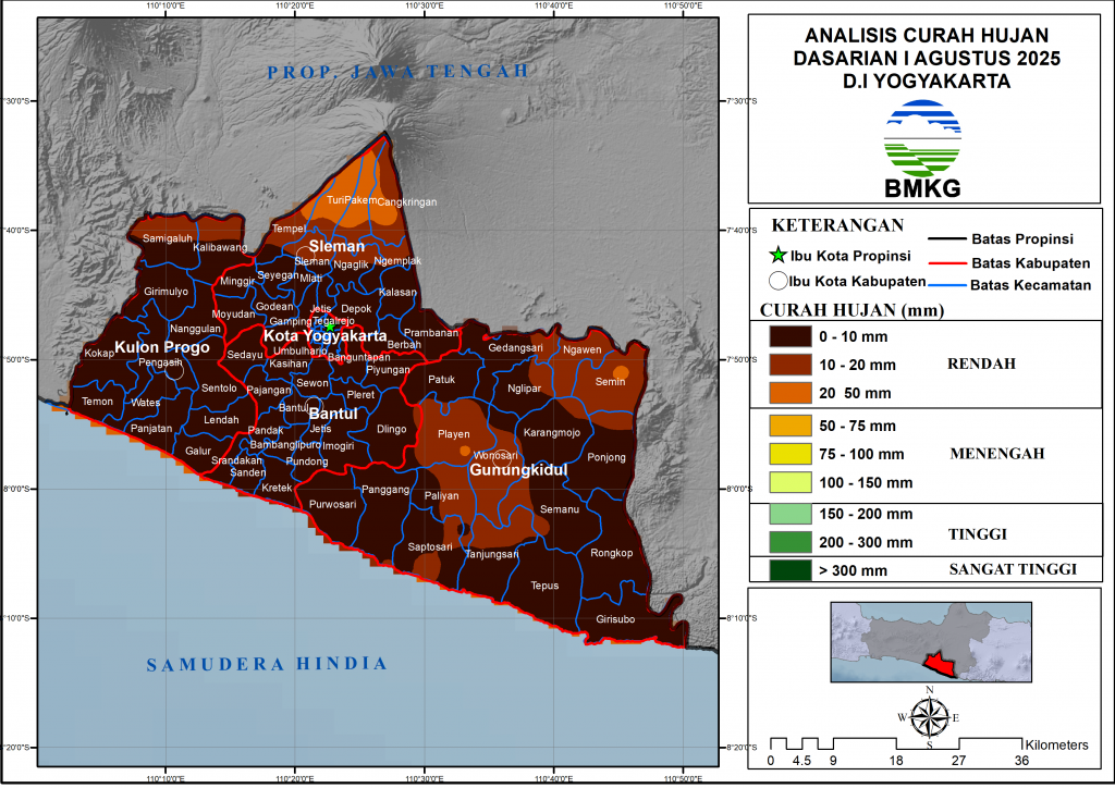 Sebaran curah hujan selama periode dasarian I Agustus 2025 (tanggal 01 s/d 10) wilayah D. I Yogyakarta dalam kategori rendah – menengah dengan curah hujan berkisar 0 – 50 mm.