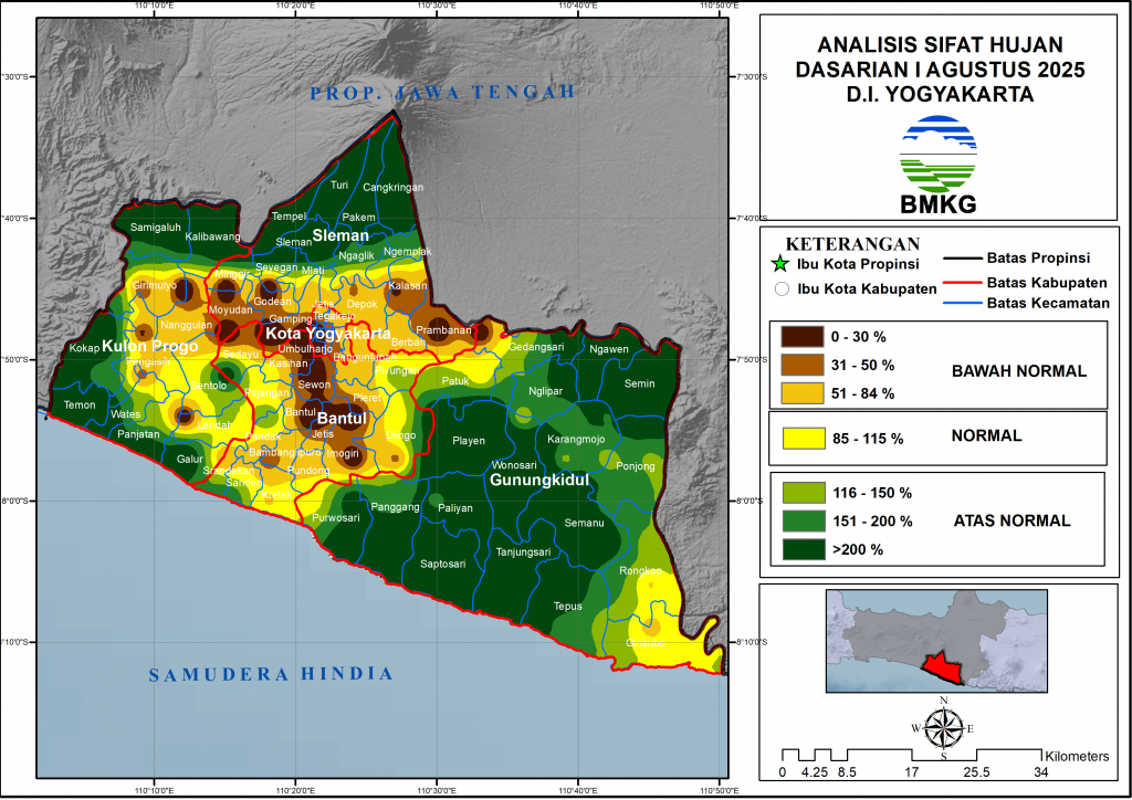 Apabila dibandingkan dengan kondisi normalnya sifat hujan dasarian I Agustus 2025 (tanggal 01 s/d 10) wilayah D. I Yogyakarta dalam kategori Bawah Normal – Atas Normal.