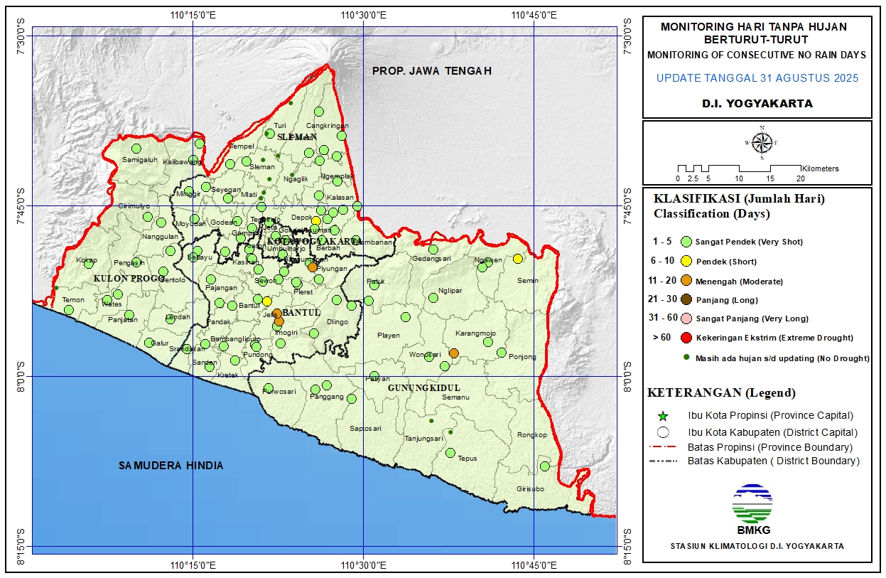 Monitoring Hari Tanpa Hujan Berturut-turut update 31 Agustus 2025 wilayah D.I Yogyakarta, berdasarkan data-data yang sudah masuk pada dasarian III (tanggal 21 s/d 31) dari pos hujan yang tersebar di wilayah D.I Yogyakarta:
