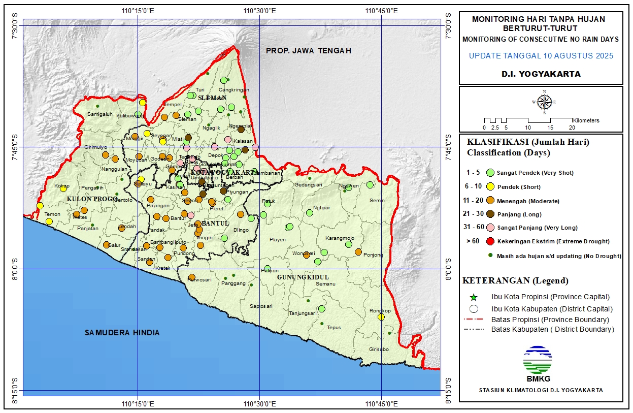 Monitoring Hari Tanpa Hujan Berturut-turut update 10 Agustus 2025 wilayah D.I Yogyakarta, berdasarkan data-data yang sudah masuk pada dasarian I (tanggal 01 s/d 10) dari pos hujan yang tersebar di wilayah D.I Yogyakarta:
