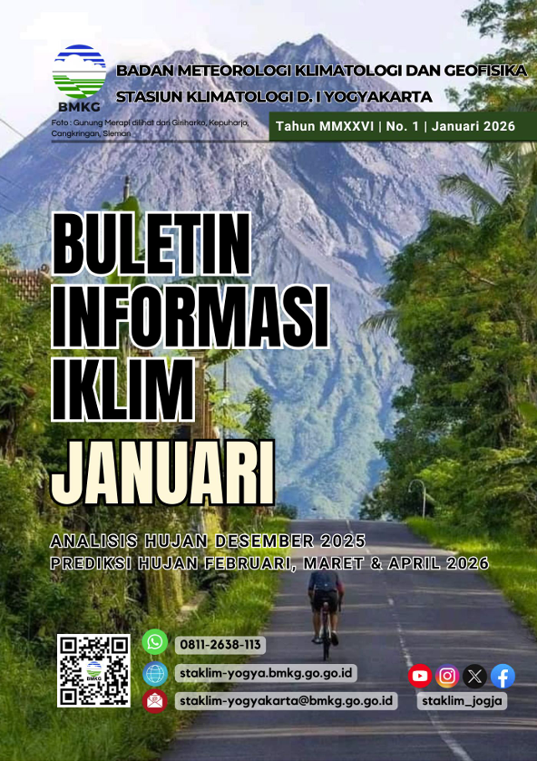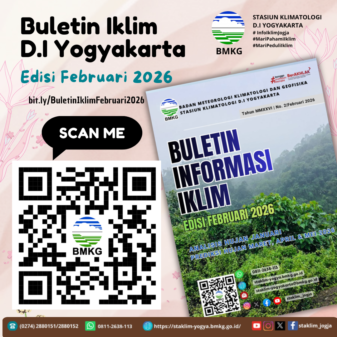 Buletin Prakiraan Hujan Bulanan memuat informasi Dinamika Atmosfer, Analisis Hujan Bulanan, Prakiraan Hujan Bulanan, informasi hasil Analisis Tingkat Kekeringan tiga bulanan serta informasi ketersediaan air bagi tanaman yang disusun berdasarkan data hasil pengamatan dari 120 stasiun/pos hujan yang tersebar diseluruh wilayah Daerah Istimewa Yogyakarta.